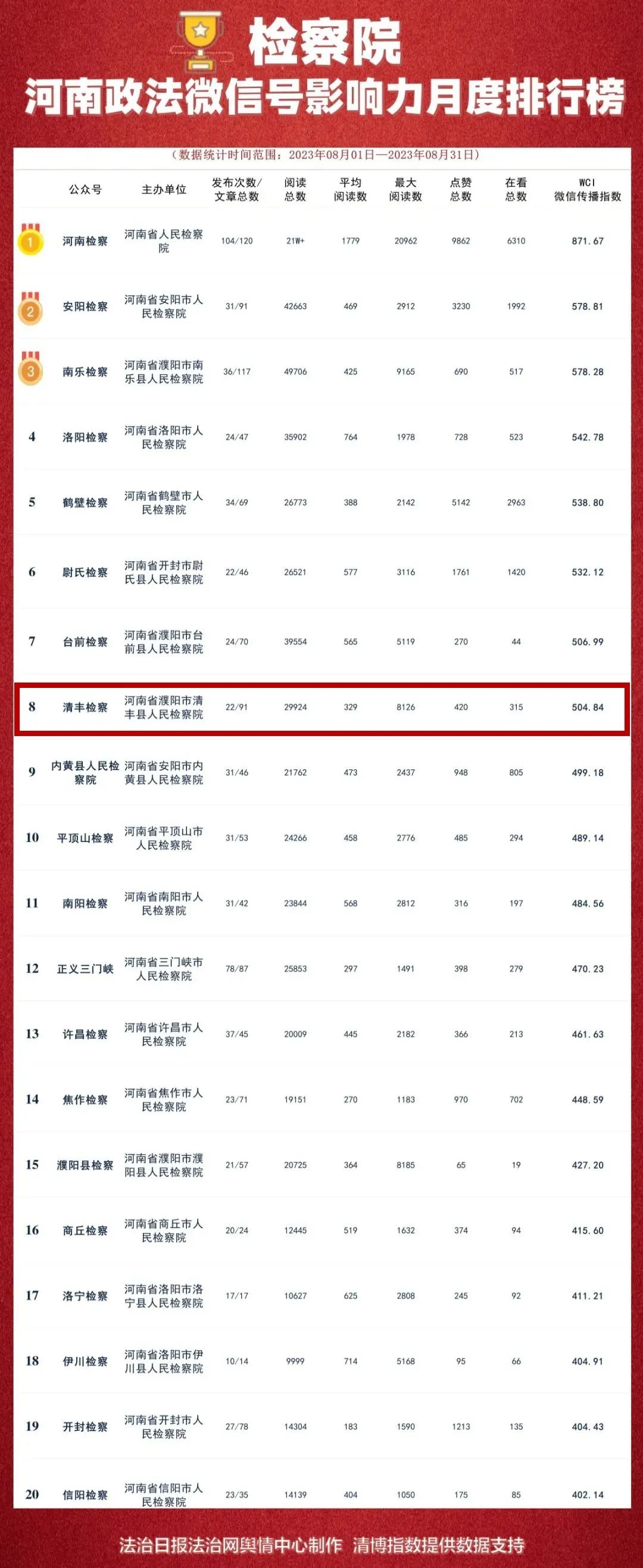 中原盾发布河南省政法机关微信公众号影响力8月排行榜 清丰检察上榜