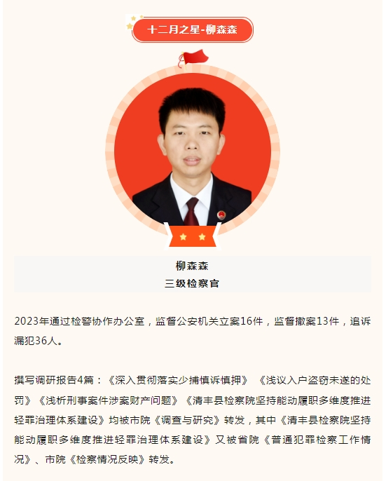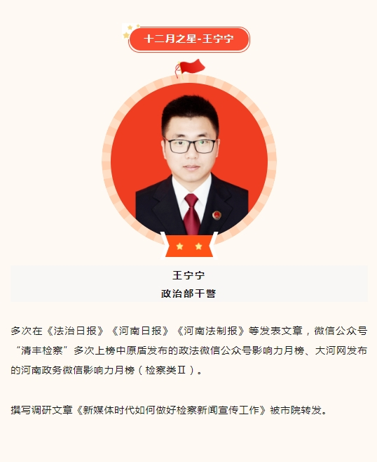 为进一步激发我院检察干警干事创业的工作激情,全面提高干警的职业素养和专业技能,清丰县检察院开展每月“检察之星”评选活动,通过弘扬先进典型精神,营造评能手、树先进、学业务、创佳绩的工作氛围,激励干警坚守初心、争创一流业绩,打造一支信念坚定、执法为民、敢于担当、清正廉洁的过硬检察队伍,树立检察机关良好形象。