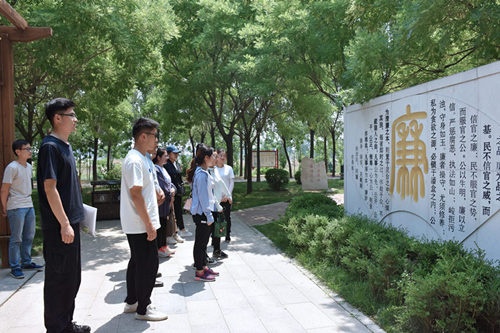 实地参观中,人事科干警李鑫带领新进书记员一同前往“廉园”,参观了由“思廉明志”、“廉”“俭”、“忠”等雕塑组成的二十余景点,穿梭廉政诗词长廊,在美景中接受廉政文化的熏陶和洗礼。
