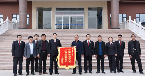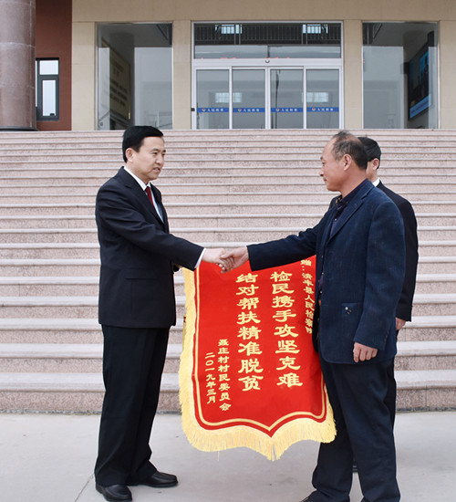 3月18日,阳邵镇聂庄村党支部书记聂拥军等四人及清丰县检察院派驻该村第一书记谭会彬将一面印有“检民携手攻坚克难 结对帮扶精准脱贫”的锦旗送到清丰县检察院党组书记、检察长王克臣手中,感谢2018年以来对聂庄村脱贫攻坚工作的支持。