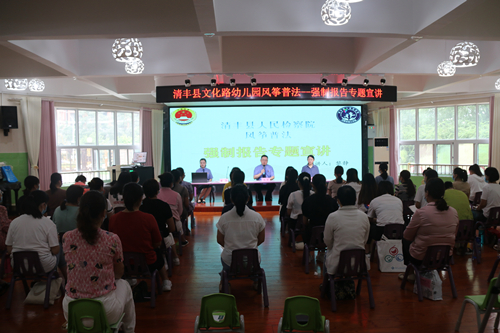 近年来,侵害未成年人犯罪持续上升,案件预防难、发现难、取证难;教师违法犯罪案件屡被曝光,给整个教师队伍带来了严重的负面影响和评价。为进一步提高教师强制报告法治意识、有效预防校园内教职员工违法犯罪行为的发生,8月24日上午,清丰县人民检察院风筝未检工作室干警受邀来到清丰县文化路幼儿园,为该园一百余名教师们上了一堂特别的法治培训课,为老师们开学前“充电”。