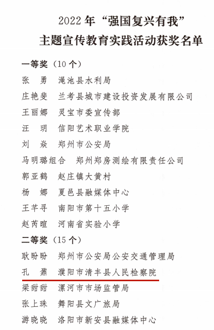 2022年“强国复兴有我”主题宣传教育实践活动获奖名单的通知》,清丰县人民检察院检委会专职委员、第四检察部主任孔鼐荣获二等奖。