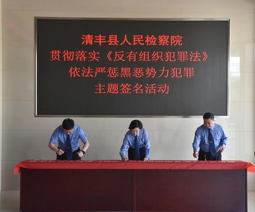 在机关办公楼大厅举行“贯彻落实《反有组织犯罪法》依法严惩黑恶势力犯罪”主题签名活动,全院干警积极响应、举笔郑重签名。同时组织干警签订承诺书,切实增强干警开展常态化扫黑除恶的责任感和使命感,激励干警忠于职守、履职尽责,为助推我院始终在法治轨道上开展扫黑除恶斗争提供了坚实的基础。